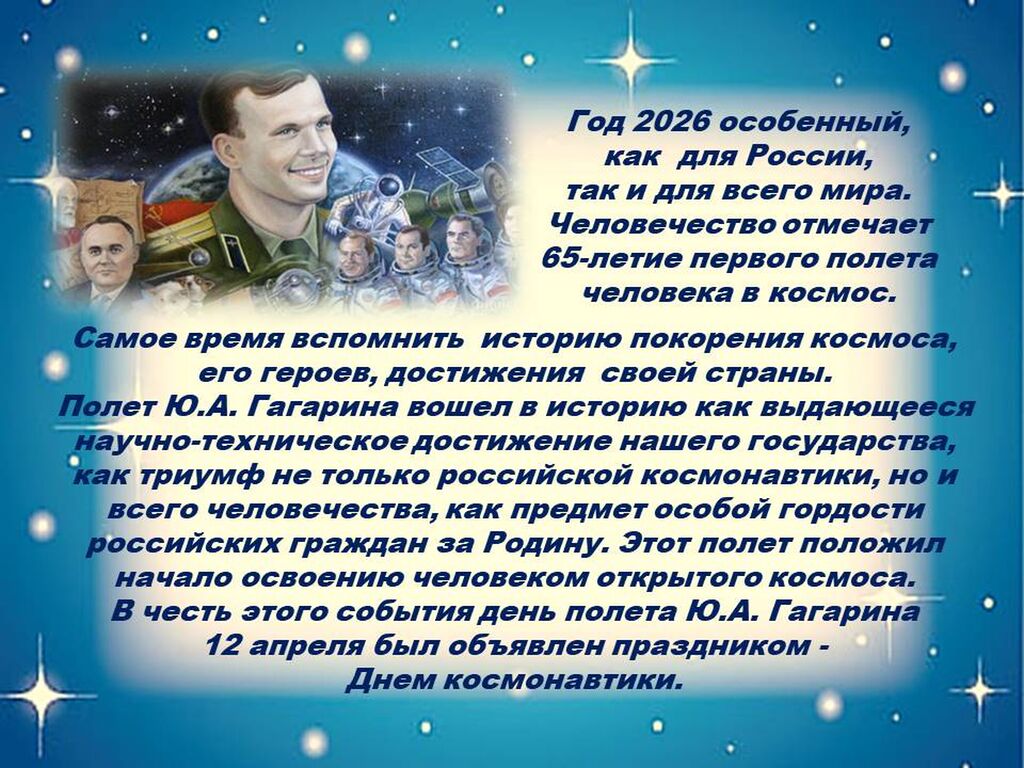 До недавнего времени День космонавтики был днём одного события: 12 апреля. С 2026 года, в 65 – ю годовщину полёта Юрия Гагарина, формат меняется. Президент России подписал указ о проведении ежегодной Недели космоса — с 6 по 12 апреля.